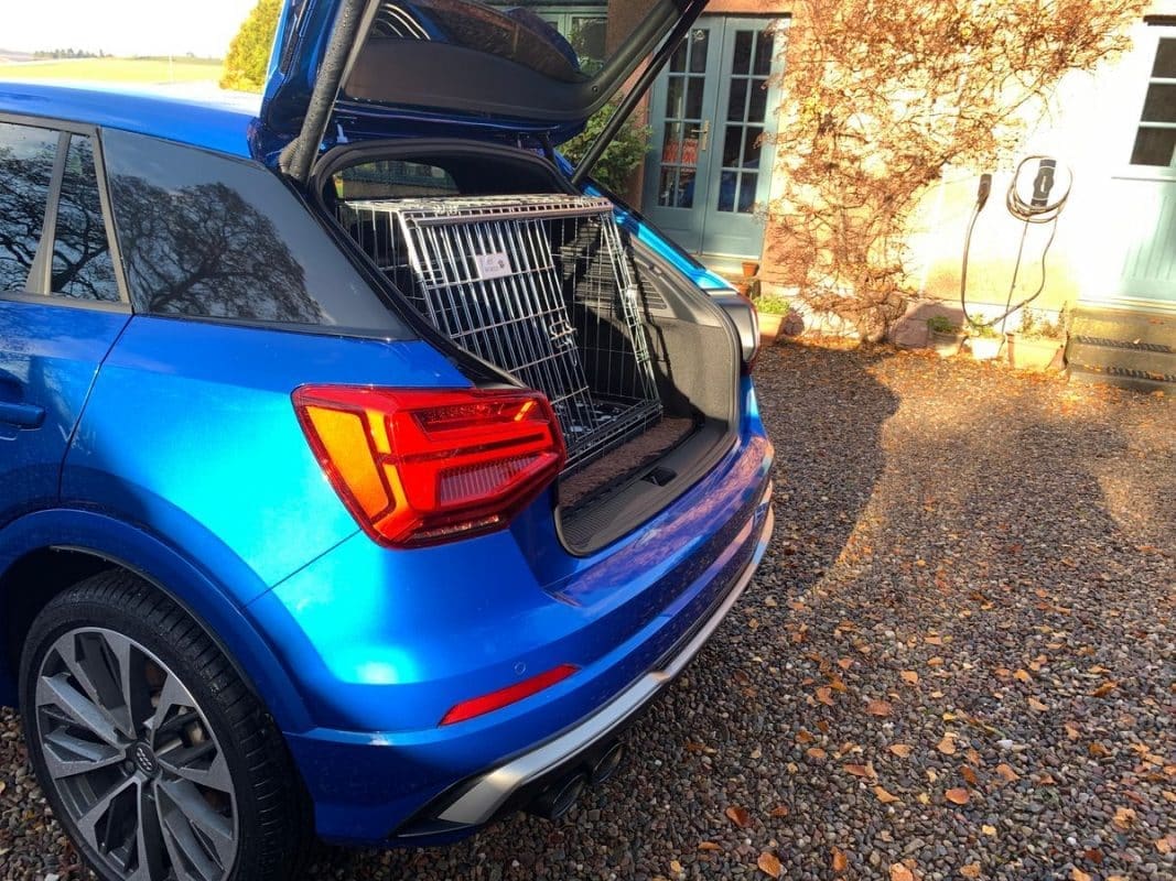 Our folding car dog cage is suitable for the AUDI Q2. The unique sloped design, part of a European Community Registered Design, helps the dog cage fit within the boot of your car while maximising the boot space available. A standard dog cage that is not designed for a car has several drawbacks for car use including, front opening doors that do not open past the lip of the boot and the rectangular shape can impede the closure of the hatchback and risk cracking or smashing the rear window.