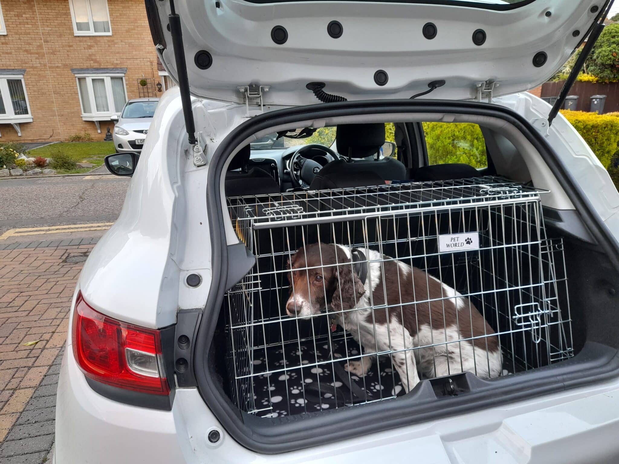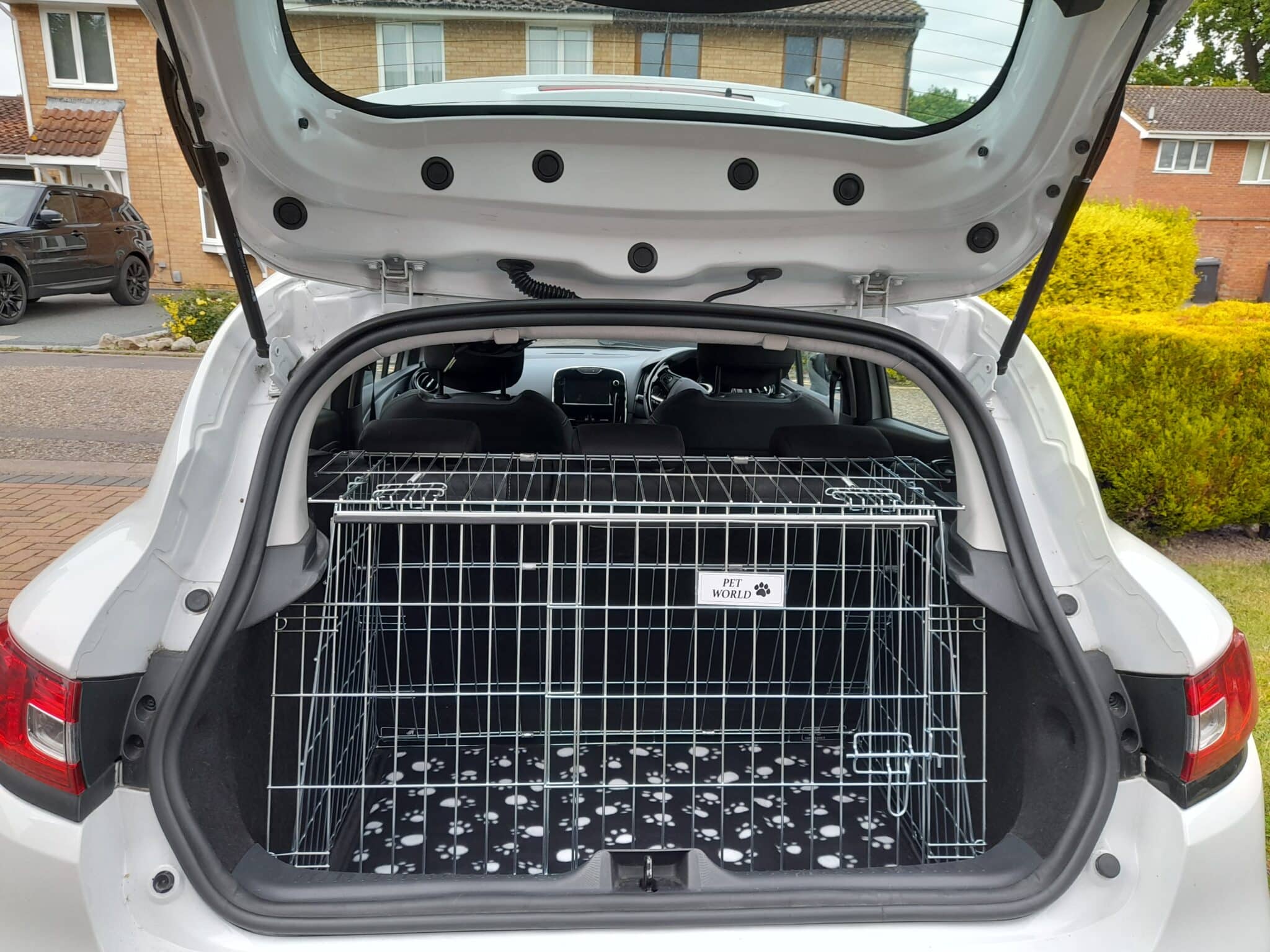 Nuestra jaula plegable para perros es apta para el Renault Clio – 2014. Su exclusivo diseño inclinado, que forma parte de un diseño registrado en la Comunidad Europea, ayuda a que la jaula para perros encaje en el maletero de su coche y maximiza el espacio disponible. Una jaula para perros estándar que no está diseñada para un coche tiene varios inconvenientes para su uso en el coche, entre ellos, las puertas de apertura frontal que no se abren más allá del borde del maletero y la forma rectangular que puede impedir el cierre del portón trasero y correr el riesgo de romper o aplastar la luneta trasera.