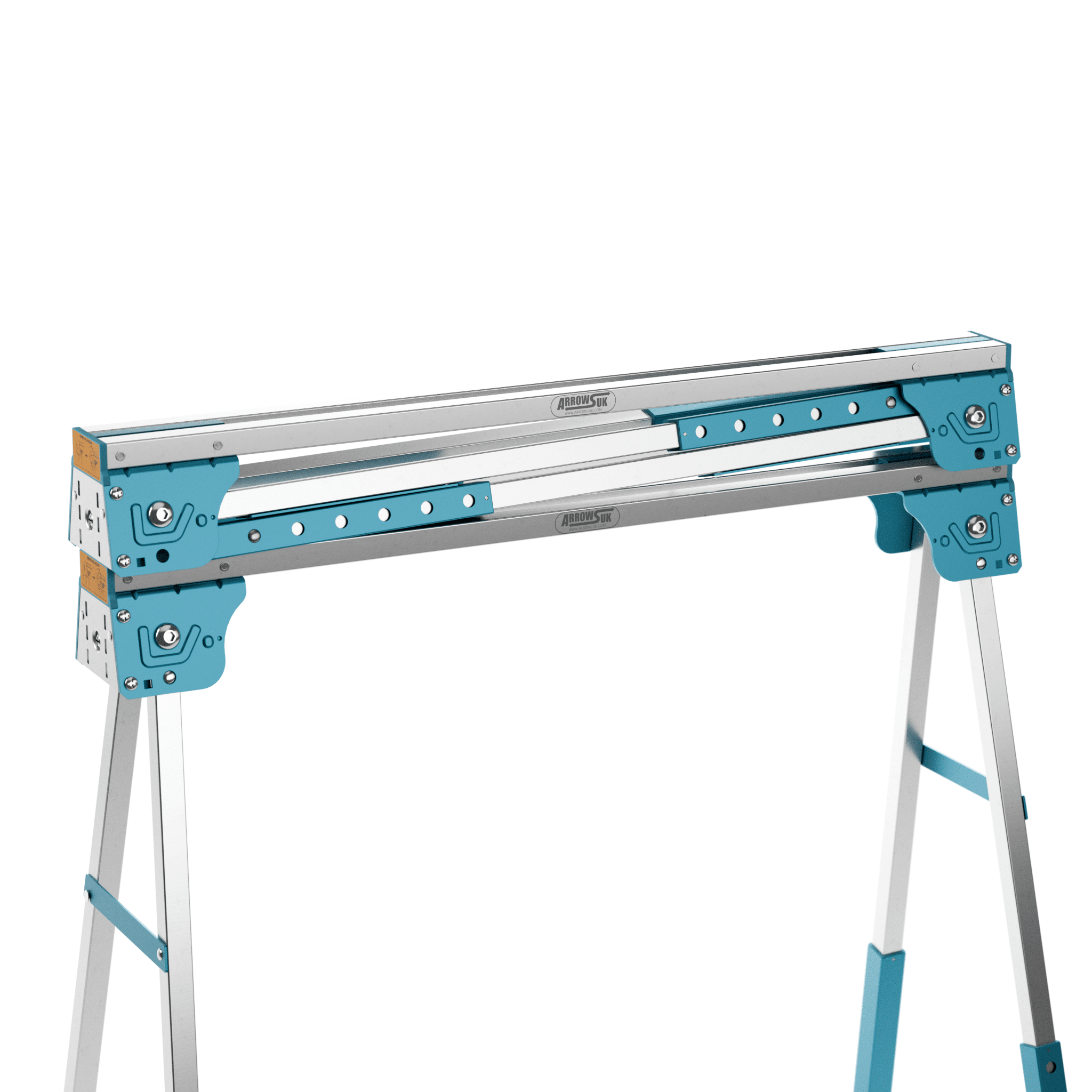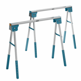 Portable power: Lightweight aluminium sawhorse pair folds flat to 78 × 10 × 10 cm for easy van or shed storage.