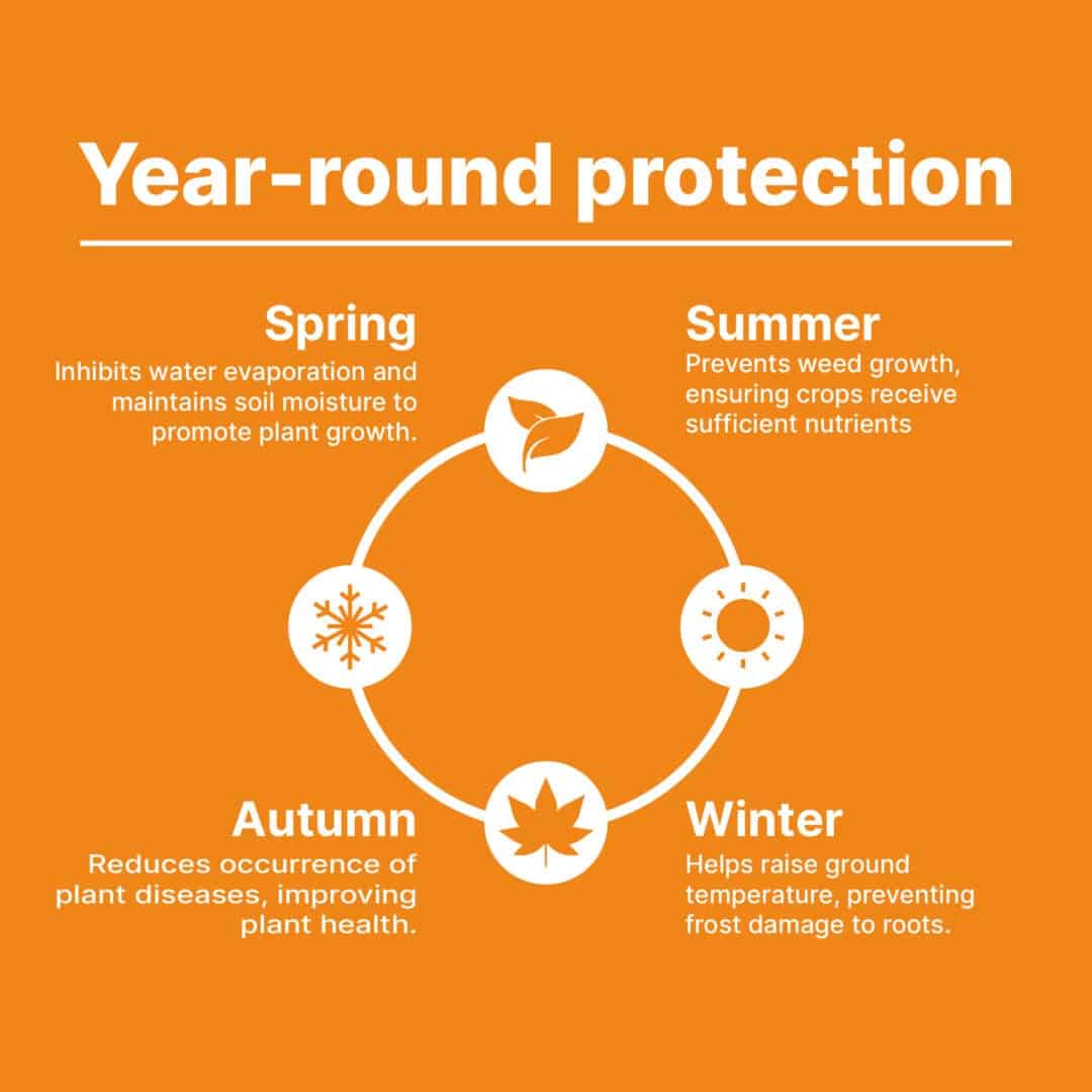 - Year-round protection – Helps retain moisture, prevent frost damage, and reduce plant diseases.