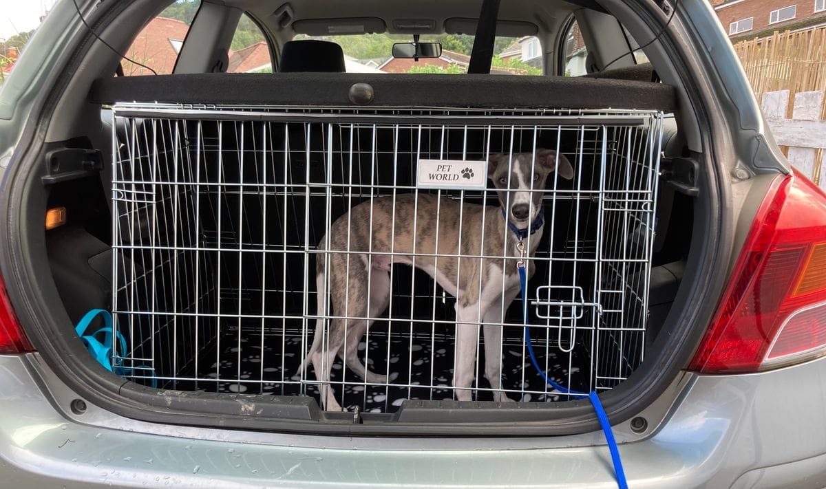 Phoned for advice mid morning on Monday. Went on website and ordered before 3:00pm crate arrived Tuesday before mid day. Well impressed with delivery. The crate fitted snuggly into the boot of my Toyota Yaris, no chance of it sliding about. I can get my whippet pup in easily and there is plenty of room for when he grows. Showed to my doggy friends and they thinks it’s brilliant!