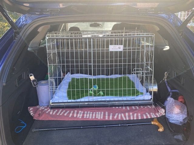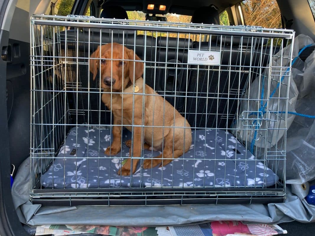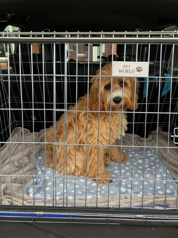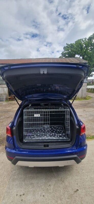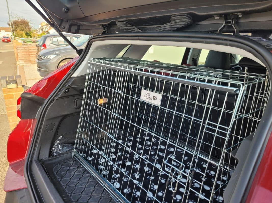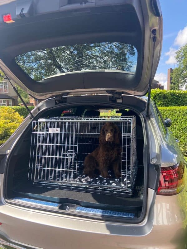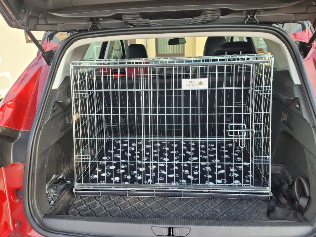 Bought to go in a Kia e Niro (just fits!) and hold two cocker spaniels. Plus point – I like the sliding door. Only downside to this crate is that you can feel the bars at the bottom, even through the supplied cushion, so I’m considering putting a piece of board in the bottom of the crate.
