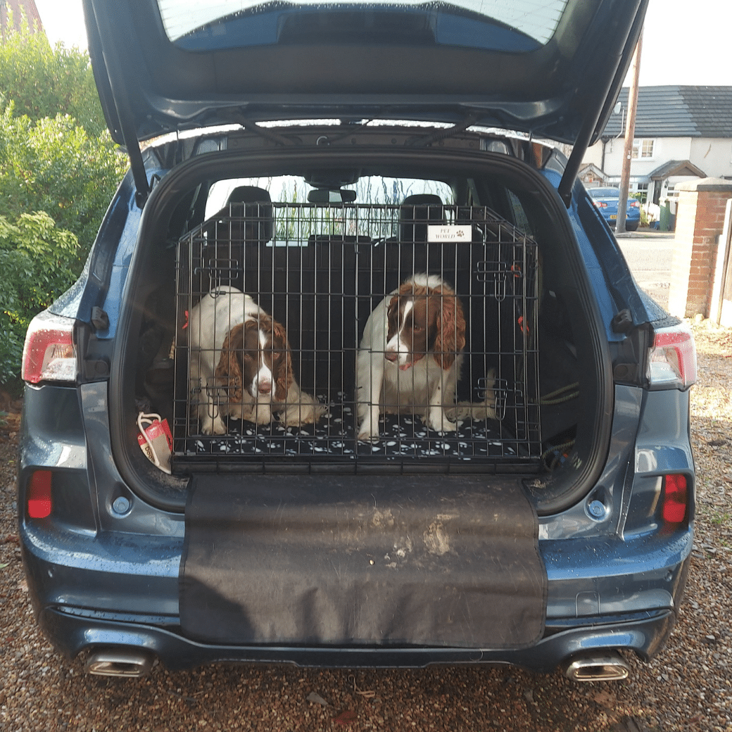 Our folding car dog cage is suitable for the Ford Kuga 2021 Onward. The unique sloped design, part of a European Community Registered Design, helps the dog cage fit within the boot of your car while maximising the boot space available. A standard dog cage that is not designed for a car has several drawbacks for car use including, front opening doors that do not open past the lip of the boot and the rectangular shape can impede the closure of the hatchback and risk cracking or smashing the rear window.